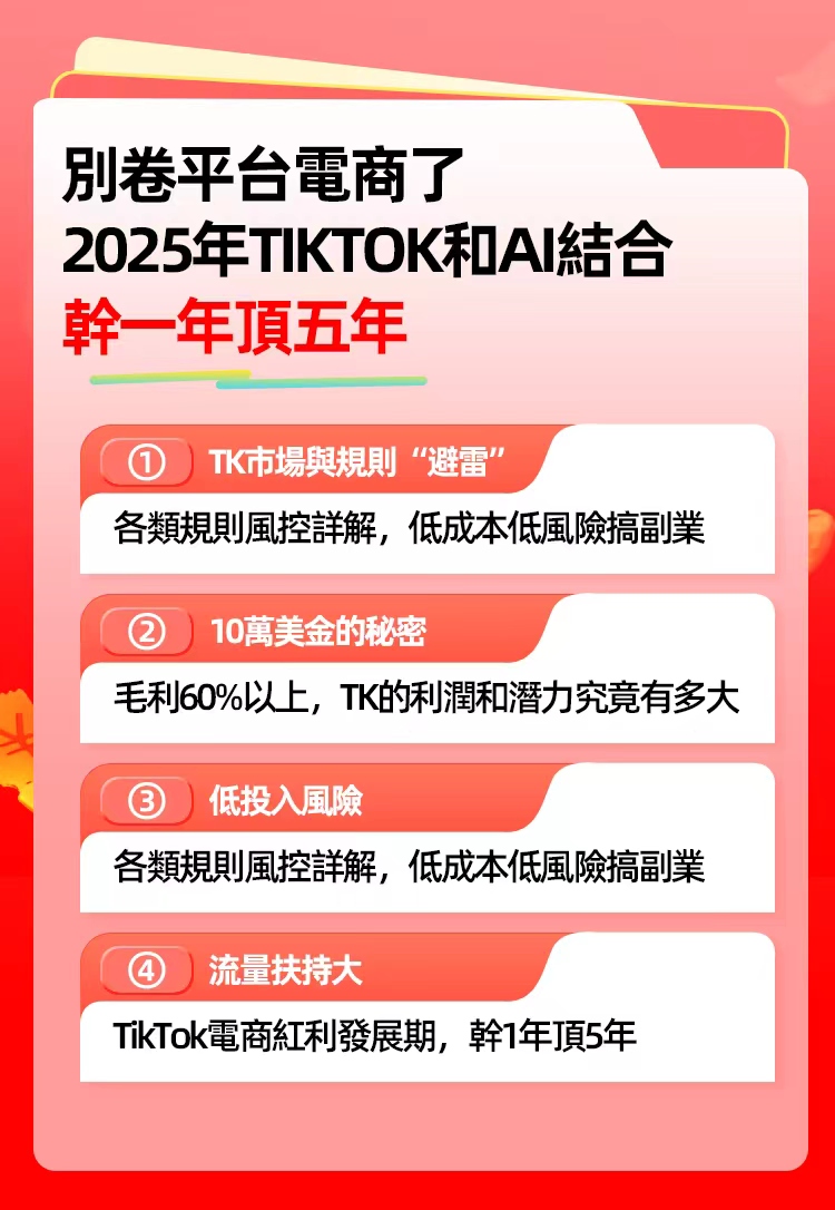 無需砸大額廣告費!以低成本 → 高營收的策略,活用 AI 輔助選品、素材加速、短影音切片,並以 LINE / 表單 承接名單與追蹤成效,精準引流目標客群、推動營收成長。
