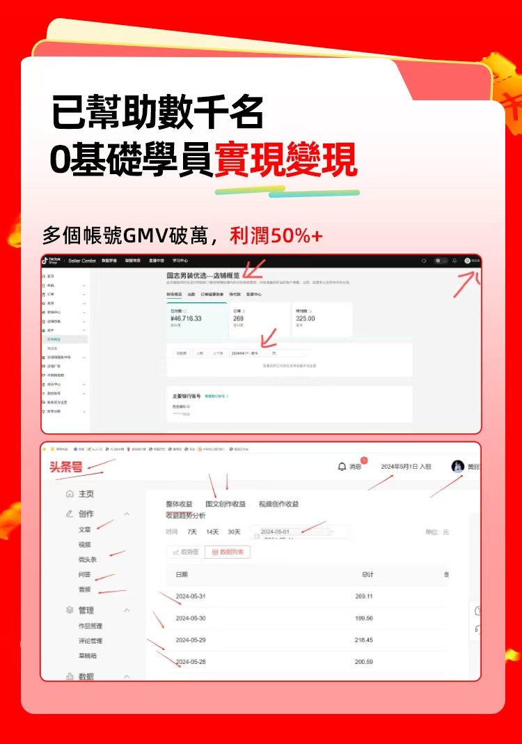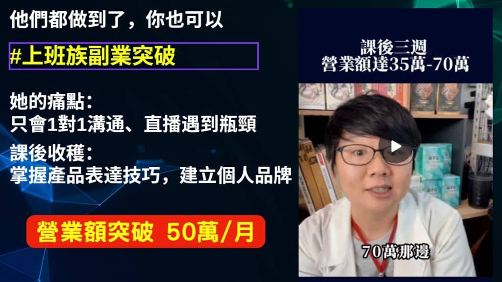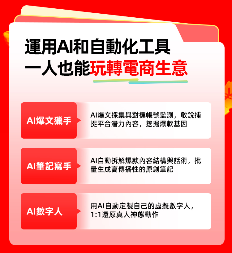 即使 0 基礎素人也能快速上手!不靠鏡頭、不靠明星光環,AI 協助生成腳本、貼文與大綱,從 0 佈局直播帶貨,學會實用賣貨技巧,讓商品更快進入變現軌道。